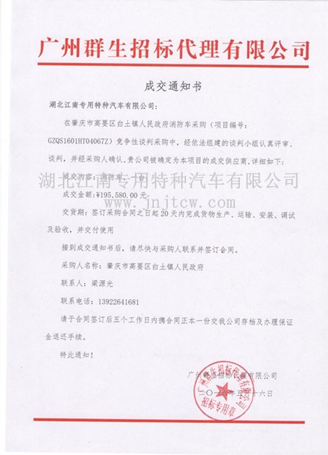 | 我公司中標肇慶高要區(qū)白土鎮(zhèn)消防車采購項目 |
